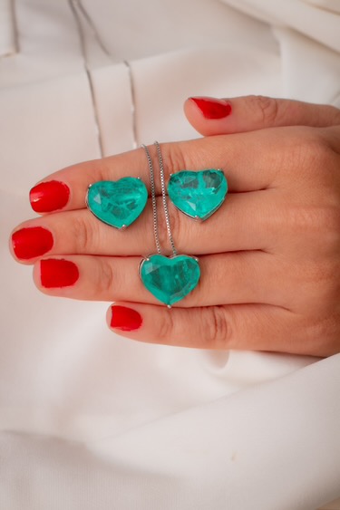 Conjunto Coração banhado no Ródio Branco com pedraria